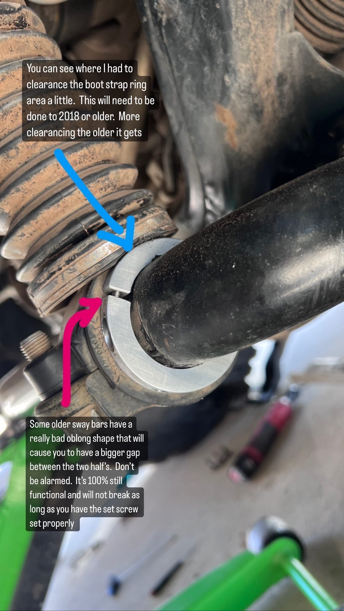 Also another thing is 2010-2017 has older style bushings and bottom caps to hold the sway bar. You will have to slightly clear the boot strap ring or get bottom caps and bushings for 2018+ Scroll through the pictures to see what clearance needs to be done on the boot strap ring for kdss shock on the front driver side!