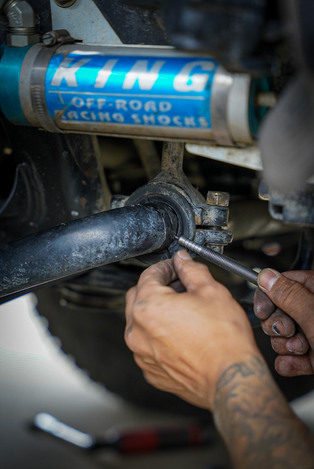 From the factory, to keep the sway bar from shifting to either side, Toyota uses a combination of rubber straps (glued and band-strapped) and pressed-on metal straps on each end. Any driving outside of normal daily driving will cause those straps to eventually fail. Depending on the situation (mainly off-roading), too much articulation can cause the sway bar to shift over way too much to one side which can result in the kdss shock body making contact with the frame.