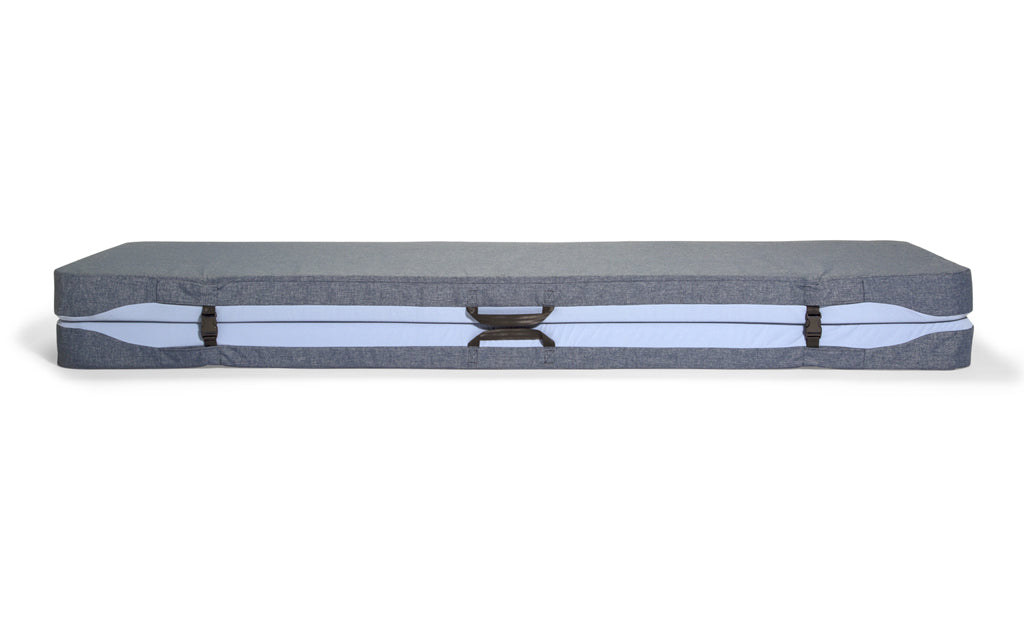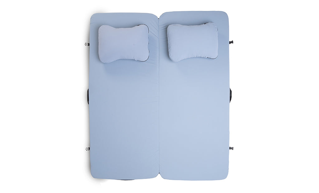 The Dually, our two-person camping mattress pad, was designed for flat and dry sleeping spaces found in truck bed campers, rooftop tent pop-ups, and tents. Dually Long 50"x78", Dually Wide 60"x72", Dually Short 50"x64" & Dually Queen 78"x60".